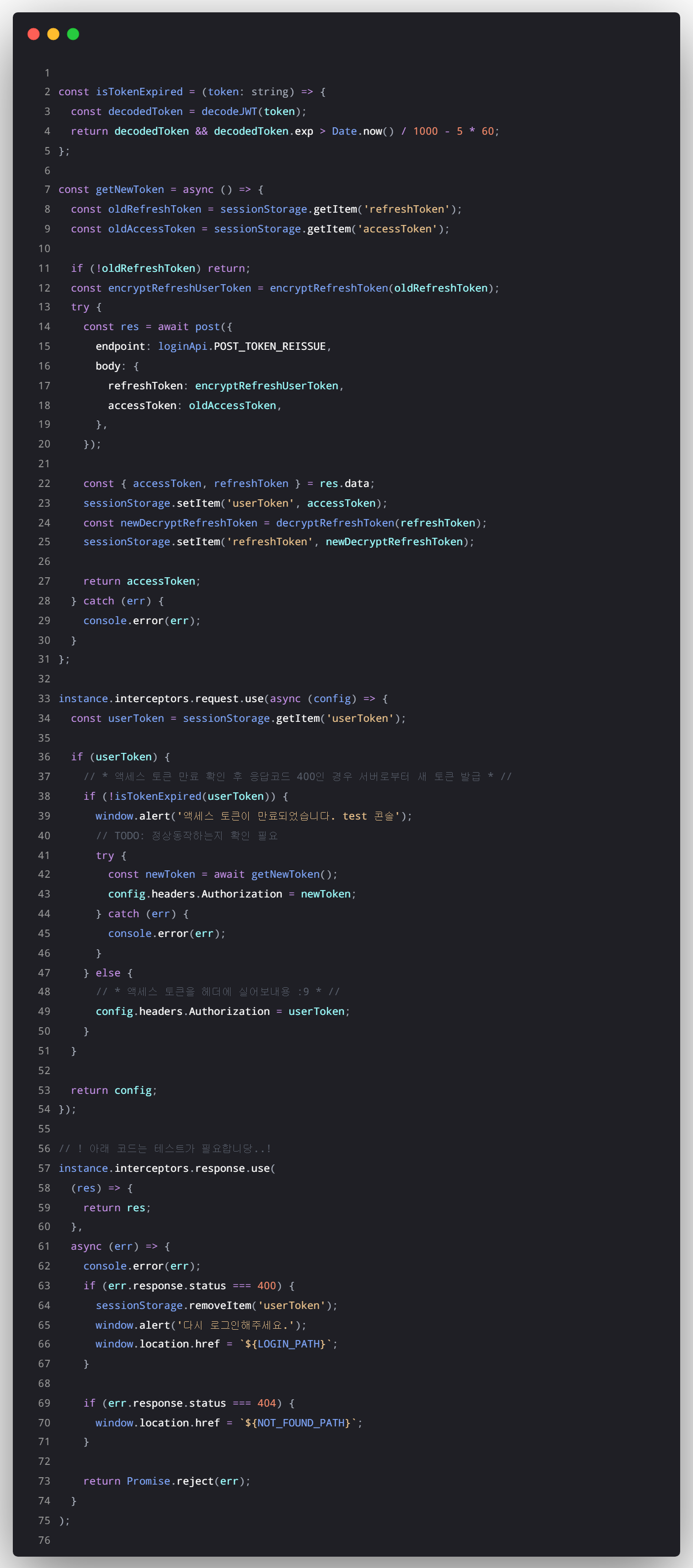 이제 진짜진짜 핵심인 액세스 토큰이 만료됐을 때 새 액세스 토큰을 발급받는 로직이 들어가야 한다.